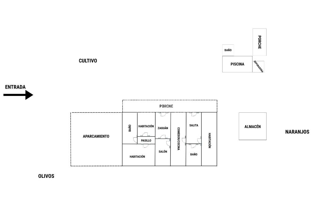 Tiene una construcción de 311m2. Distribuidos en zona de piscina, casa, almacén y zona de aparcamiento.